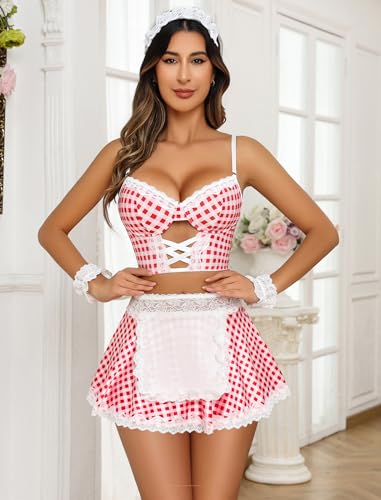 • Maid costume set package includes: Crisscross Top *1, Mini Skirt with G-string *1, Hairband *1, Hand circle *2, 5 piece set, best costume for Halloween.
